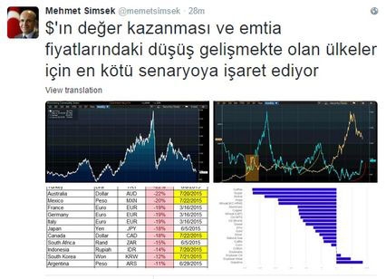 Maliye Bakanı Mehmet Şimşek, Twitter’daki paylaşımında, ”Doların değerin kazanması ve emtia fiyatlarındaki düşüş gelişmekte olan ülkeler için en kötü senaryoya işaret ediyor” değerlendirmesinde bulunduz