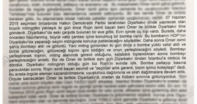 “7 Haziran 2015 seçimleri öncesinde HDP tarafından Diyarbakır ilinde yapılacak olan büyük mitingden yaklaşık iki gün önce Rojin isimli bayan beni Ömer isimli şahıs ile Diyarbakır’a gönderdi. Diyarbakır’da eski çarşıda bulunan bir eve gittik. Evde üç kişi vardı. Burada daha önceden hazırlanmış, büyük valiz çantası içine konulmuş bir bomba vardı. Bu bombanın HDP’nin Diyarbakır’da yapacağı seçim mitinginde konulup patlatılacağını söylediler. Daha sonra Ömer isimli şahıs bombayı aldı ve götürdü. Yani miting gününden iki gün önce o bomba yüklü valizi aldı ve birine götüreceğini, götüreceği kişinin işini bildiğini ve onun yerleştireceğini söyledi.