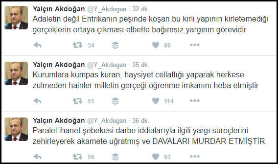 Paralel ihanet şebekesinin, darbe iddialarıyla ilgili yargı süreçlerini zehirleyerek akamete uğrattığını ve davaları murdar ettiğini belirten Akdoğan, “Kurumlara kumpas kuran, haysiyet cellatlığı yaparak herkese zulmeden hainler, milletin gerçeği öğrenme imkanını heba etmiştir. Adaletin değil entrikanın peşinde koşan bu kirli yapının kirletemediği gerçeklerin ortaya çıkması elbette bağımsız yargının görevidir.” değerlendirmesini yaptı.