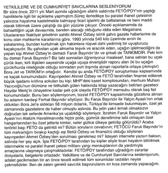 İbrahim Faruk Bayındır ve Yalçın Ayaslı’nın Atatürk Havalimanında hiçbir polis, gümrük denetimine tabi olmayan özel hangarlarından bu özet jetlerle kimler, neler gizlice ülkeye getirilip götürüldü? Acaba terörist başı FETO da getirildi mi?”