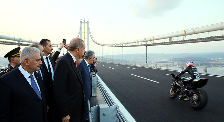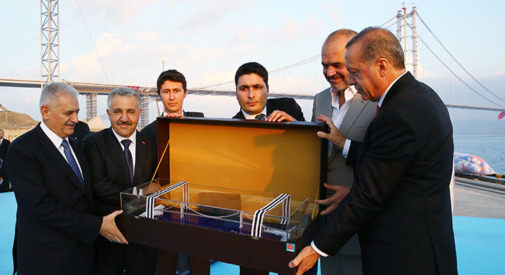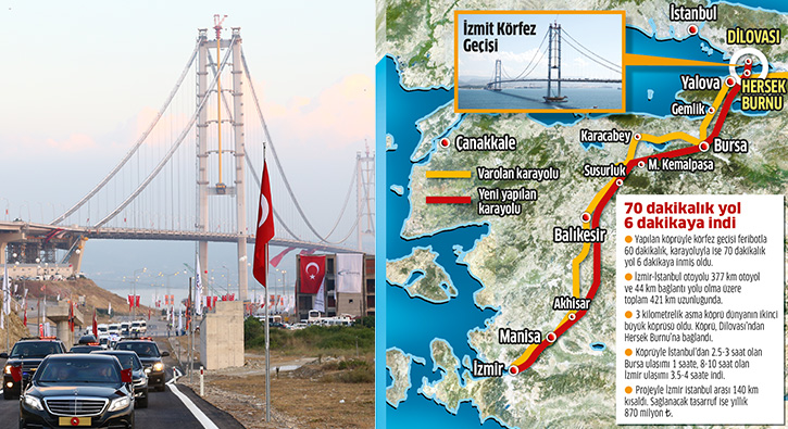 Cumhurbaşkanı Erdoğan ve Başbakan Yıldırım’ın katıldığı törenle dünyanın en büyük orta açıklıklı 4’üncü asma köprüsü Osmangazi açıldı. Köprü ile Körfez 4 dakikada geçilebilecek. İstanbul ile İzmir arasındaki ulaşım süresini de 9 saatten 3,5 saate indirecek olan köprünün açılış töreninde Erdoğan, “Şimdi gündemimizde Çanakkale 1915 Köprüsü ve Kanal İstanbul var” dedi.
